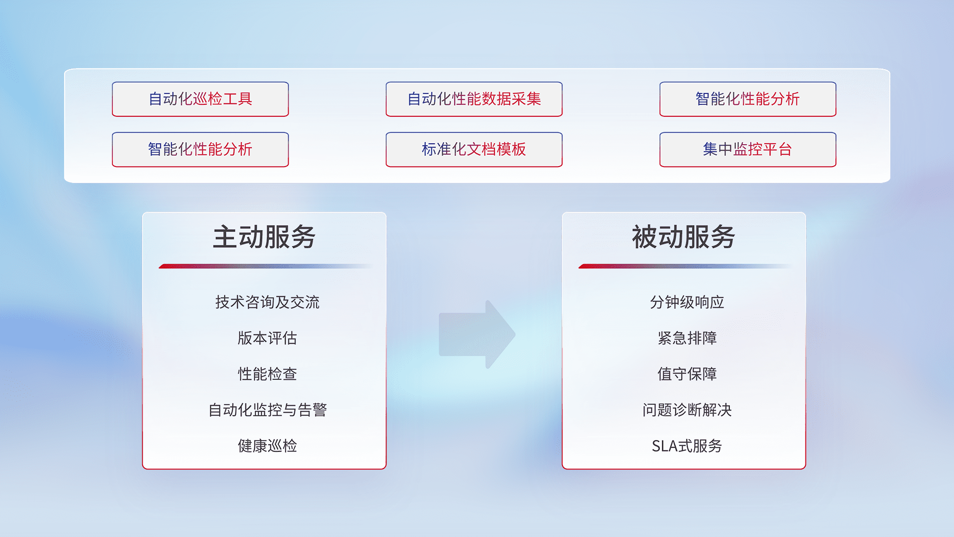 智能化工具和标准化文档,,,,保障服务质量,,,,提供主动服务(包含技术咨询、、、版本评估、、性能检查、、、自动化监控与告警、、健康巡检)和被动服务包含(分钟级响应、、、、紧急排障、、值守保障、、、、问题诊断解决、、、SLA服务)。。